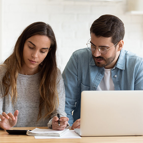 ← Concentrated young married spouse calculating monthly family budget together.